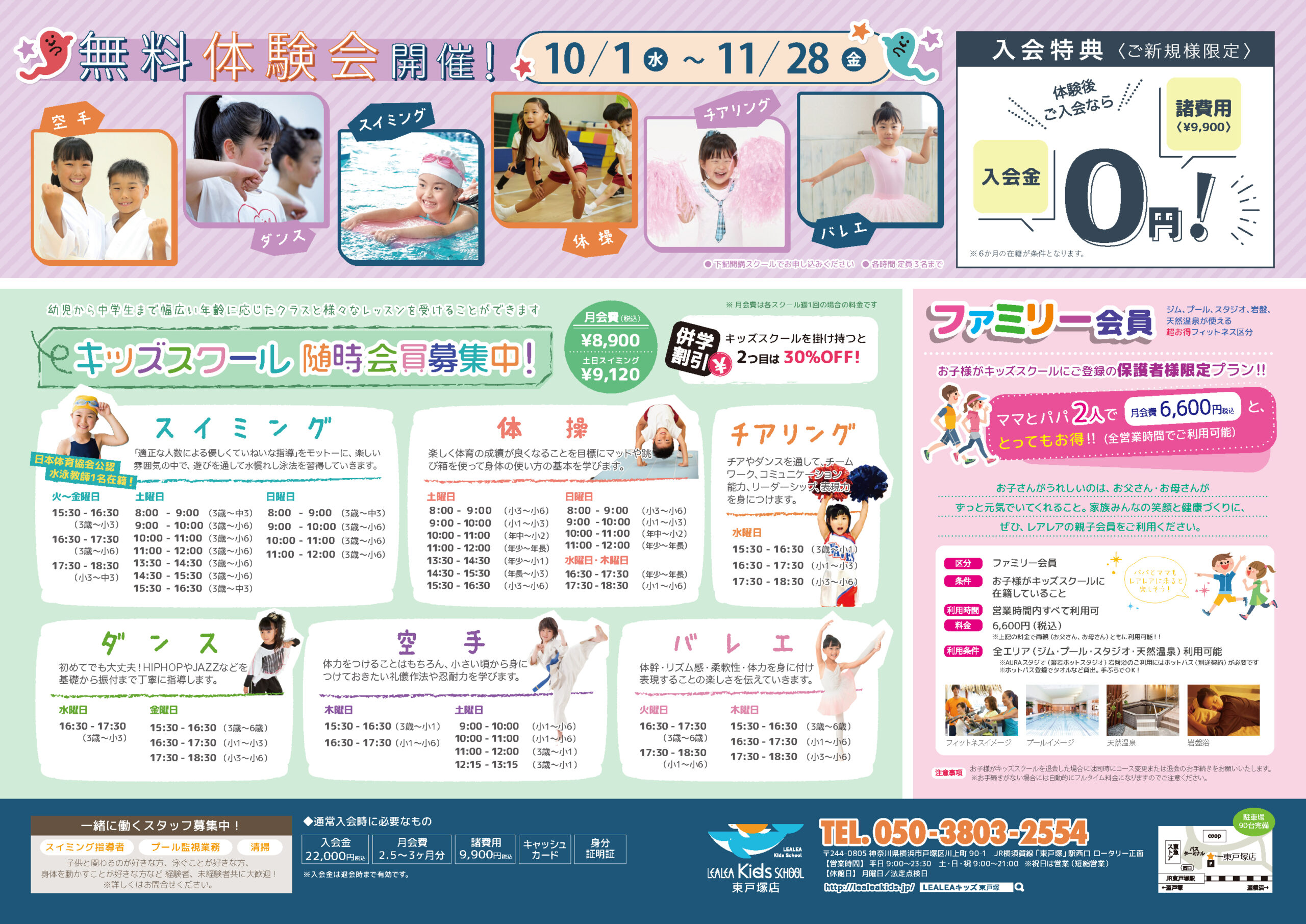 レアレアキッズスクール東戸塚校では、10/1(水)〜11/28(金)まで空手、ダンス、スイミング、体操、チアリング、バレエの無料体験会を開催いたします。
