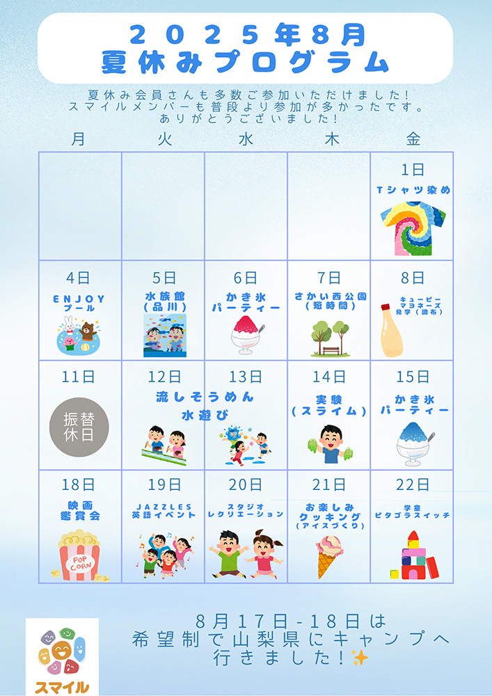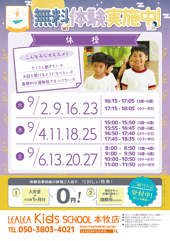 <時間(対象)> 8:30〜(幼児)/9:30〜(幼児)/13:00〜(幼児)/10:30〜(小学生)/14:30〜(小学生)
